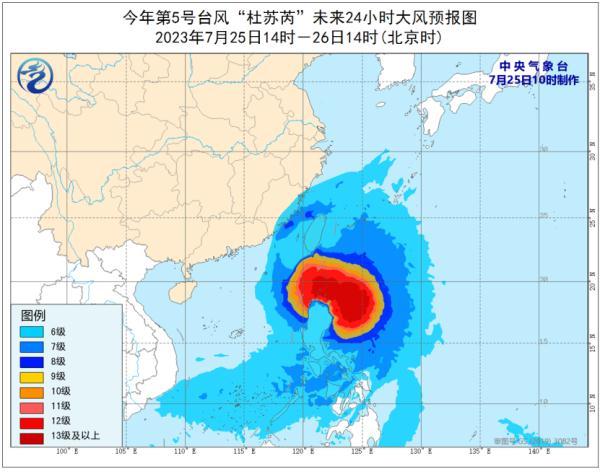 25日14时至26日14时,巴士海峡、台湾以东洋面、南海东部和南部海域、台湾海峡、台湾岛沿海、福建沿海将有6-8级风、阵风9-10级,其中巴士海峡、南海东北部偏东海域、南海中东部偏东海域风力可达9-12级、阵风13-15级,台风中心经过的附近海域风力可达13-17级,阵风17级以上。