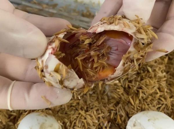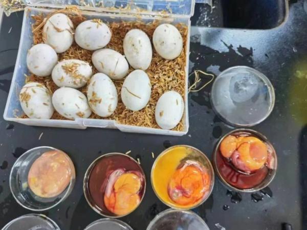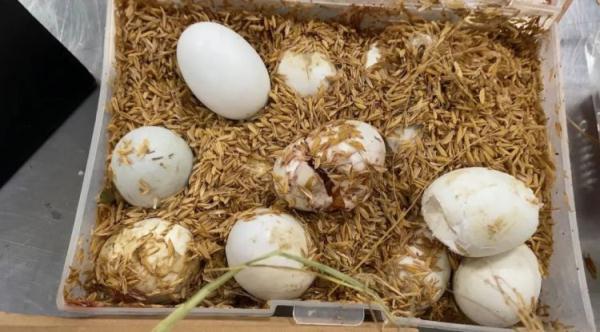 厦门机场海关对一架进境航班进行监管时,发现两名无申报旅客携带的三个泡沫箱存在异常。现场关员将泡沫箱打开后,一股异味扑面而来。经查验,关员在泡沫箱内查获大量层层堆叠的白色蛋类物品,其中多个呈现受精卵半孵化状态,能清楚看到眼睛和血管,个别破损流出的蛋液存在变质的情况。经厦门海关技术中心鉴定,确认为绿头鸭卵。