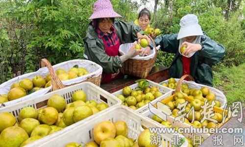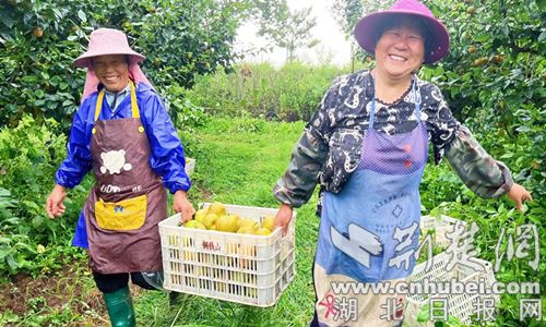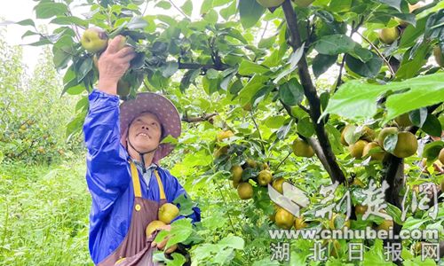 荆楚网(湖北日报网)讯(记者 安从斌 通讯员 胡敬彬)7月25日,记者在钟祥市铜钱山农业风情园水果种植基地的梨园里看到,漫山的梨树上挂满了成熟的“翠冠”梨,虽然天空下着雨,但是基地的工作人员穿着雨衣,正在紧张有序地采摘梨子。