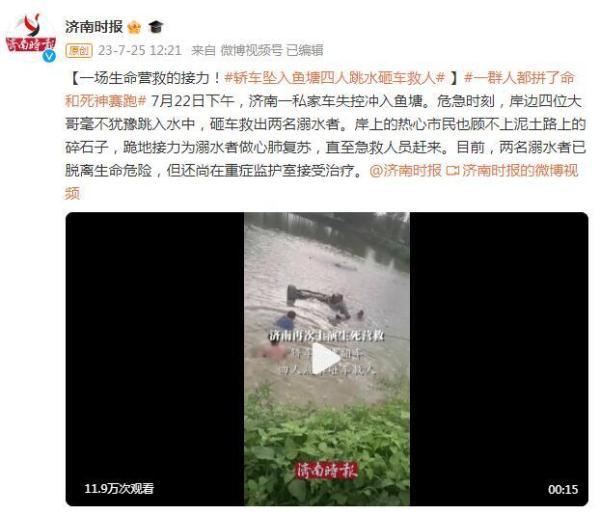 7月22日下午,济南一私家车失控冲入鱼塘。危急时刻,岸边四位大哥毫不犹豫跳入水中,砸车救出两名溺水者。岸上的热心市民也顾不上泥土路上的碎石子,跪地接力为溺水者做心肺复苏,直至急救人员赶来。目前,两名溺水者已脱离生命危险,但还尚在重症监护室接受治疗。