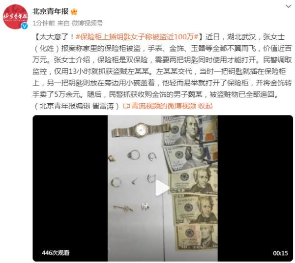 近日,湖北武汉,张女士(化姓)报案称家里的保险柜被盗,手表、金饰、玉器等全都不翼而飞,价值近百万元。张女士介绍,保险柜是双保险,需要两把钥匙同时使用才能打开。民警调取监控,仅用13小时就抓获盗贼左某某。左某某交代,当时一把钥匙就插在保险柜上,另一把钥匙则放在旁边用小碗盖着,他轻而易举就打开了保险柜,并将金饰转手卖了5万余元。随后,民警抓获收购金饰的男子魏某,被盗赃物已全部追回。