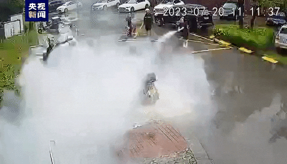 赤脚大哥从居民楼的消火栓拉出消防水带