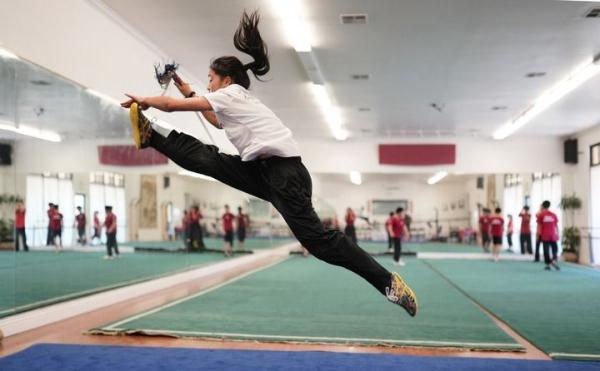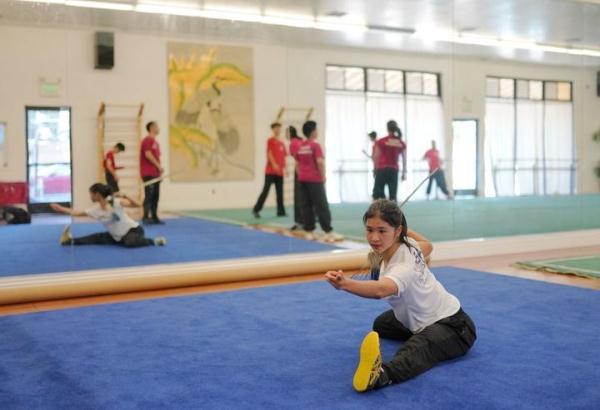 7月15日,美国加利福尼亚州旧金山湾区,美国运动员朱迪·刘正在备战成都第31届世界大学生夏季运动会太极项目。新华社记者吴晓凌摄