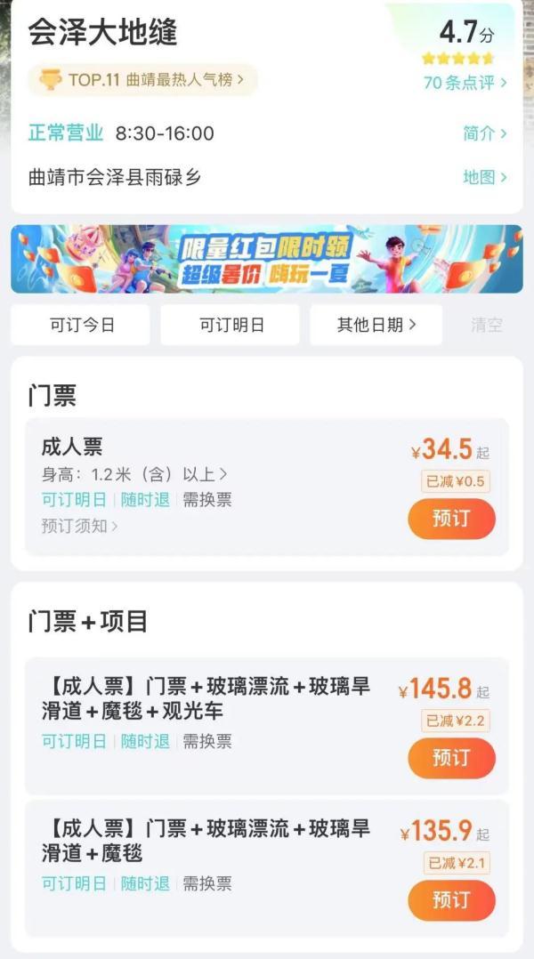 订票网站显示,会泽大地缝门票价为34.5元,票价为145.8元的套票中包含门票、玻璃漂流、玻璃旱滑道、魔毯、观光车等项目,票价为135.9的套票中包含门票、玻璃漂流、玻璃旱滑道、魔毯等项目。