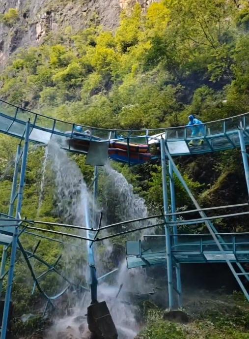 视频中,玻璃滑道有4块玻璃面板掉落,一艘皮划艇失去了玻璃面板的承接悬空在铁架上,后续有两艘皮划艇相继追尾,撞上悬空的皮划艇。皮划艇上的游客险些坠落,游客从皮划艇上站起来后小心翼翼地向走到未破裂的玻璃面板上。视频拍摄者在玻璃栈道下发出尖叫并大呼“赶紧下来!赶紧下来!”,视频发布者称,玻璃滑道断裂是落石击中导致的。