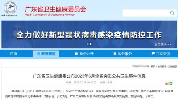 广东省卫生健康委公布2023年6月全省突发公共卫生事件信息