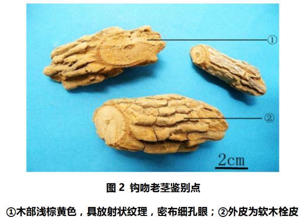 钩吻的根表面是棕黄色,有明显的纵纹,弯曲处会露出木心,并可块片状剥离;而五指毛桃的根表面一般是红棕色栓皮,纤维性强,能成片撕下。