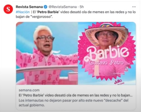 不过,哥伦比亚总统古斯塔沃·佩特罗日前却因一则芭比宣传视频陷入争议。他穿着粉色服装参加了庆祝该国独立213周年的庆祝活动,并在社交媒体账号上发布了一段充满芭比元素的宣传视频。哥政府很快将这段视频删除,但该视频仍在社交媒体上被疯传,“佩特罗芭比”的话题标签一度跃升为推特热词。有批评人士表示,在哥伦比亚诸多安全危机尚未解除的情况下,这一宣传并不恰当:“国家现状不能与一套玩偶相提并论,屠杀、绑架和勒索仍在继续。”