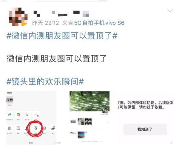 事情是这样的,一位博主发帖称微信内测朋友圈可以置顶了。从他发的图片中可以看到,朋友圈可以将某条内容长期在个人页面顶部显示。