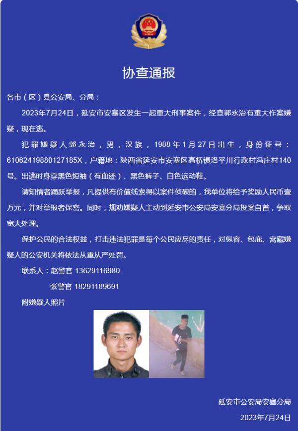 犯罪嫌疑人郭永治,男,汉族,1988年1月27日出生,身份证号:61062419880127185X,户籍地:陕西省延安市安塞区高桥镇洛平川行政村冯庄村140号。出逃时身穿黑色短袖(有血迹)、黑色裤子、白色运动鞋。