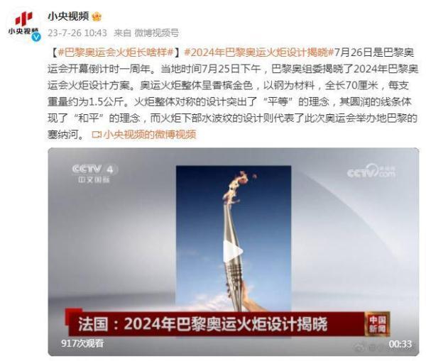 7月26日是巴黎奥运会开幕倒计时一周年。当地时间7月25日下午,巴黎奥组委揭晓了2024年巴黎奥运会火炬设计方案。奥运火炬整体呈香槟金色,以钢为材料,全长70厘米,每支重量约为1.5公斤。火炬整体对称的设计突出了“平等”的理念,其圆润的线条体现了“和平”的理念,而火炬下部水波纹的设计则代表了此次奥运会举办地巴黎的塞纳河。