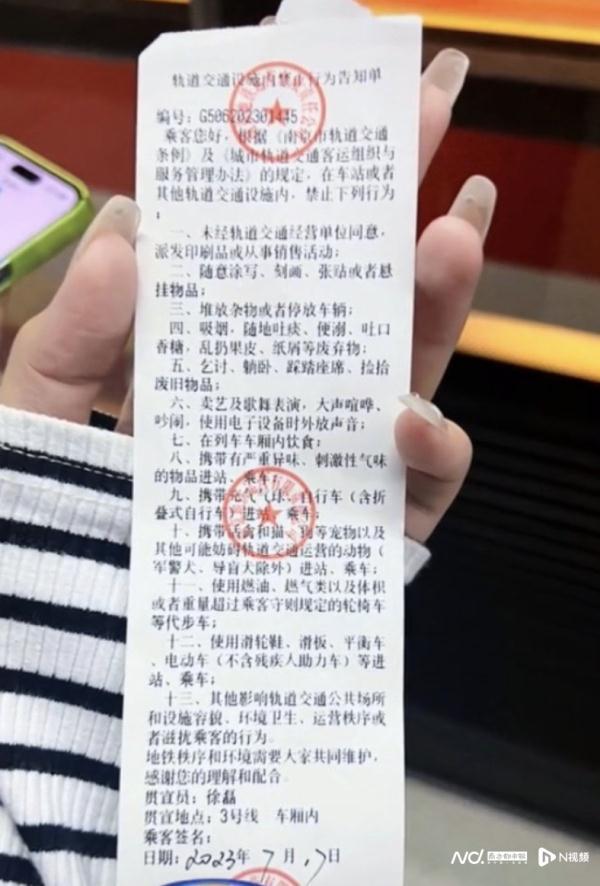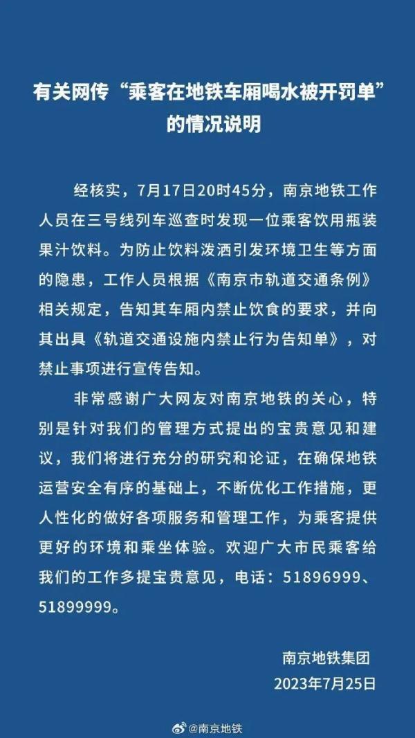 7月25日18时,@南京地铁发布《有关网传“乘客在地铁车厢喝水被开罚单”的情况说明》称,经核实,7月17日20时45分,南京地铁工作人员在三号线列车巡查时发现一位乘客饮用瓶装果汁饮料。为防止饮料泼洒引发环境卫生等方面的隐患,工作人员根据《南京市轨道交通条例》相关规定,告知其车厢内禁止饮食的要求,并向其出具《轨道交通设施内禁止行为告知单》,对禁止事项进行宣传告知。