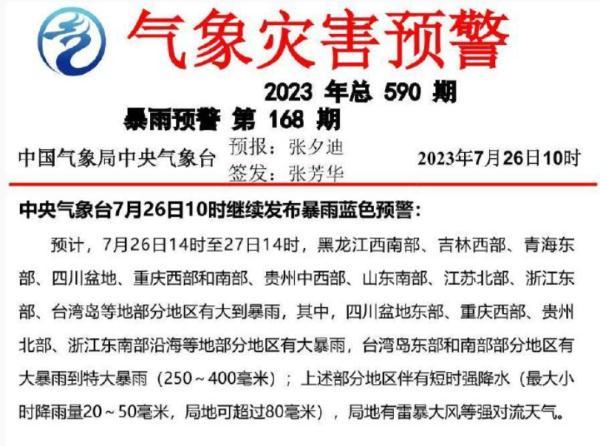 预计,7月26日14时至27日14时,黑龙江西南部、吉林西部、青海东部、四川盆地、重庆西部和南部、贵州中西部、山东南部、江苏北部、浙江东部、台湾岛等地部分地区有大到暴雨,其中,四川盆地东部、重庆西部、贵州北部、浙江东南部沿海等地部分地区有大暴雨,台湾岛东部和南部部分地区有大暴雨到特大暴雨(250~400毫米);上述部分地区伴有短时强降水(最大小时降雨量20~50毫米,局地可超过80毫米),局地有雷暴大风等强对流天气。