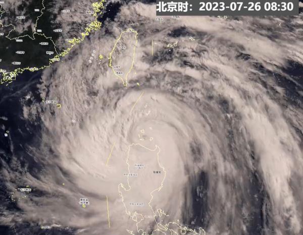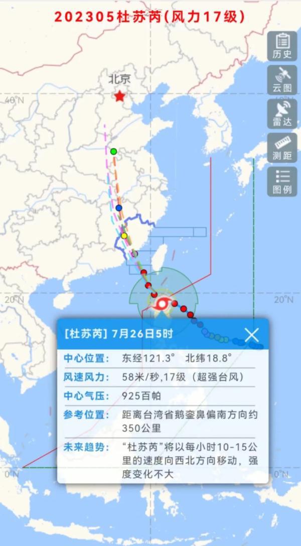 今年第5号台风“杜苏芮”(DOKSURI)(超强台风级)的中心今天(26日)上午8点钟位于我国台湾省鹅銮鼻偏南方大约350公里的巴士海峡南部海面上,就是北纬18.8度、东经121.3度,中心附近最大风力有17级(58米/秒),中心最低气压925百帕,七级风圈半径300-450公里,十级风圈半径120-180公里,十二级风圈半径90-120公里。