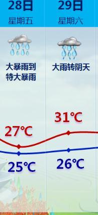 降水影响27 日夜里起降水逐渐增强,预计 27 日夜里~29 日 我市有大暴雨到特大暴雨过程,主要降水时段为 27 日夜间到 28 日夜间。预计过程累计雨量可达 180~300 毫米, 局部超 350 毫米。小时雨强最大可达 80 毫米。降水时伴有短时强降水、雷雨大风等强对流性天气。