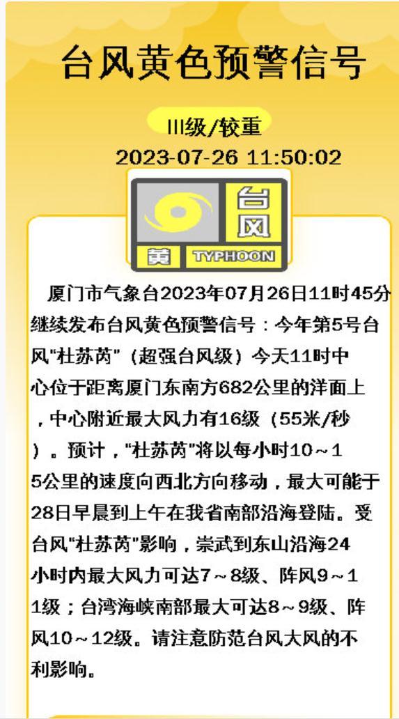 预计26日下午到27日上午,厦门沿海将出现30-100厘米的风暴增水。沿海海浪黄色警报:预计 26 日中午到27日中午,台湾海峡北部将出现 3.0-5.0米的大到巨浪,台湾海峡南部将出现4.0-7.0 米的巨到狂浪,近海海域海浪预警级别为黄色;厦门沿海将出现2.5-3.5米的大浪,该近岸海域海浪预警级别为黄色。