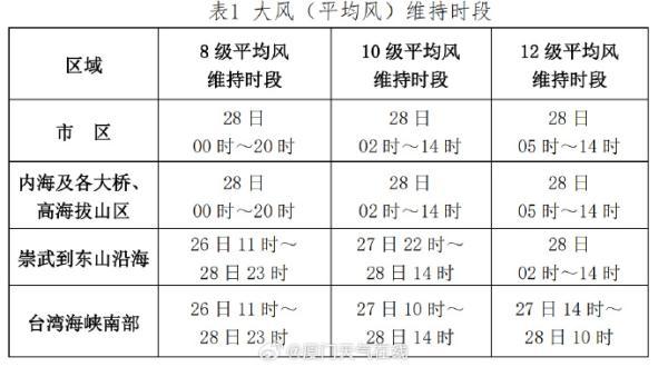 风力影响市区最大风力可达 10~12 级、阵风 13~14 级; 内海及各大桥、高海拔山区最大可达 10~13 级、阵风14~15 级;崇武到东山沿海最大可达 13~15 级、阵风 16 级以上;台湾海峡南部最大可达 14~16 级、阵风 17级以上。29 日白天风力逐渐减弱。