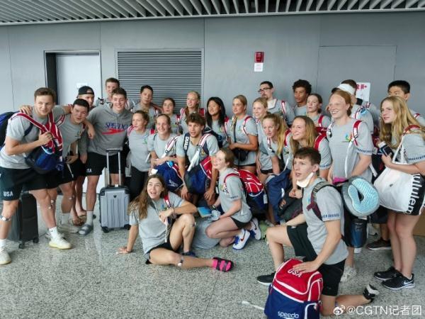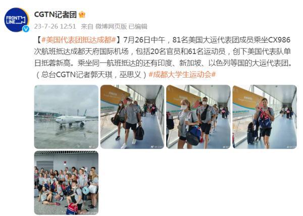 7月26日中午,81名美国大运代表团成员乘坐CX986次航班抵达成都天府国际机场,包括20名官员和61名运动员,创下美国代表队单日抵蓉新高。乘坐同一航班抵达的还有印度、新加坡、以色列等国的大运代表团。(总台CGTN记者郭天琪,巫思义)