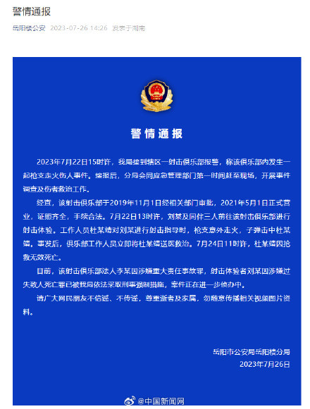 7月26日,湖南岳阳市公安局岳阳楼分局通报:2023年7月22日15时许,我局接到辖区一射击俱乐部报警,称该俱乐部内发生一起枪支走火伤人事件。目前,该射击俱乐部法人李某因涉嫌重大责任事故罪,射击体验者刘某因涉嫌过失致人死亡罪已被我局依法采取刑事强制措施,案件正在进一步侦办中。(岳阳楼公安)