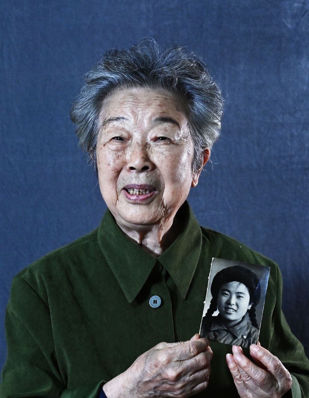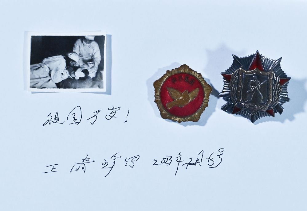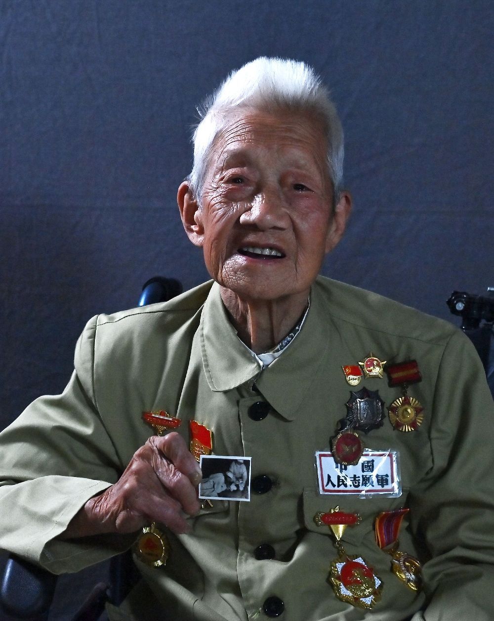 女,88岁,北京人,1951年初入朝。中国人民志愿军15军45师卫生员,电影《上甘岭》中卫生员王兰的原型。她在上甘岭战场上,坚守在山洞里悉心护理伤员,鼓舞他们战胜伤痛。王清珍以出色的表现荣立了二等功,被授予二级战士荣誉勋章。王清珍手中拿着的这张照片是她在1952年12月五圣山坑道救护所,把饭嚼碎、用嘴给重伤员喂饭时的画面。王清珍的事迹被开国将军秦基伟写进回忆录。