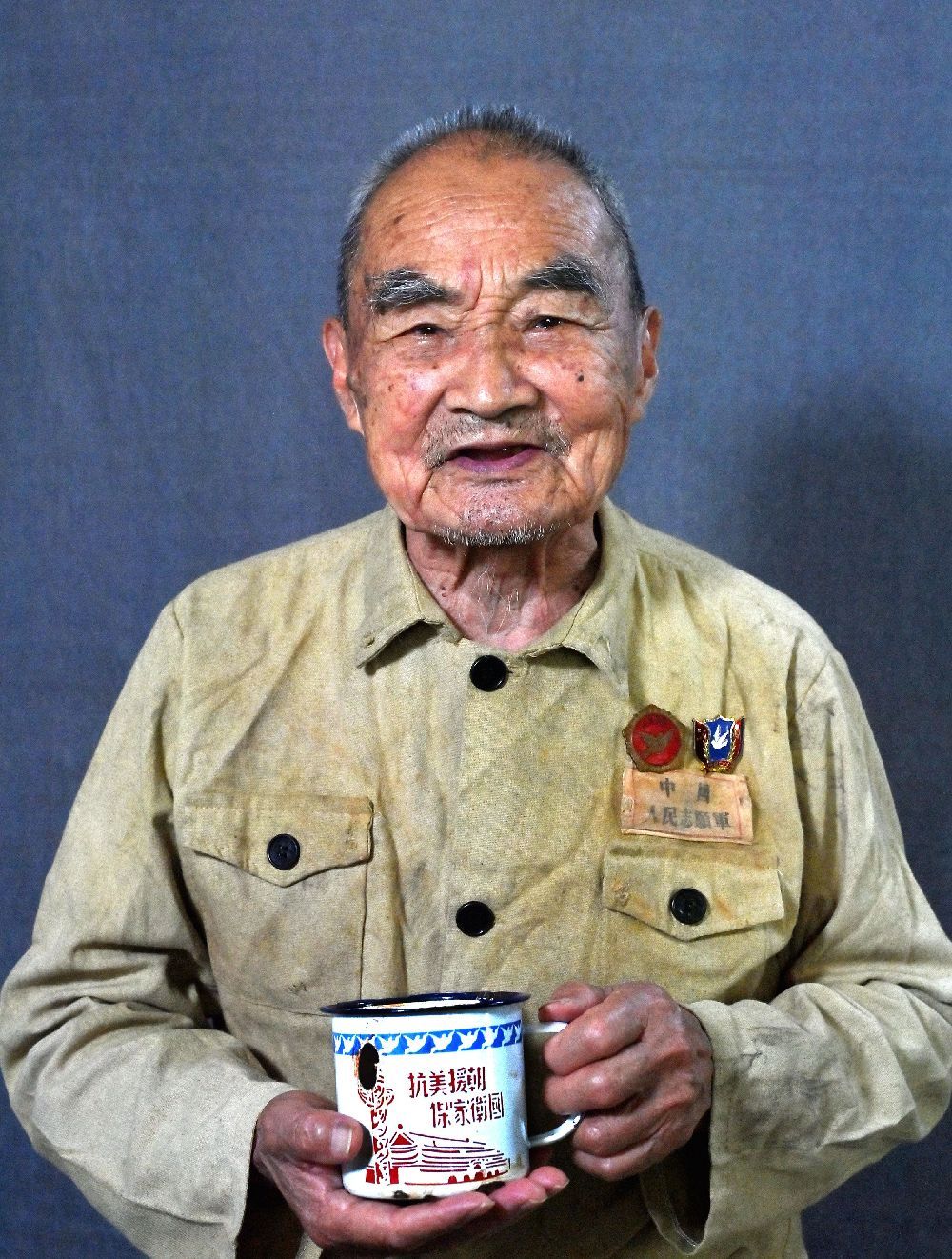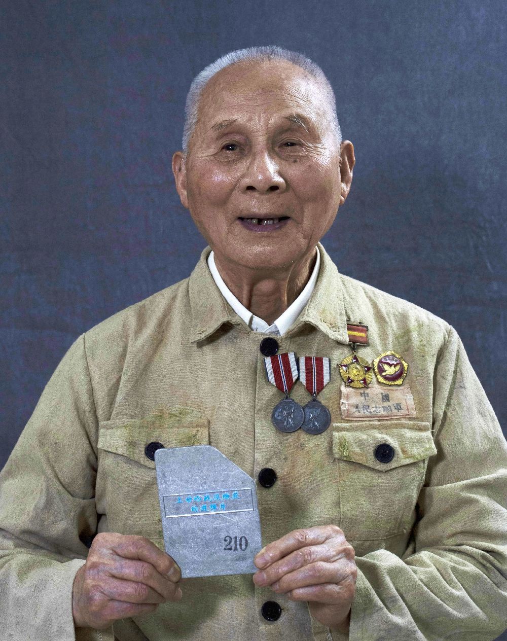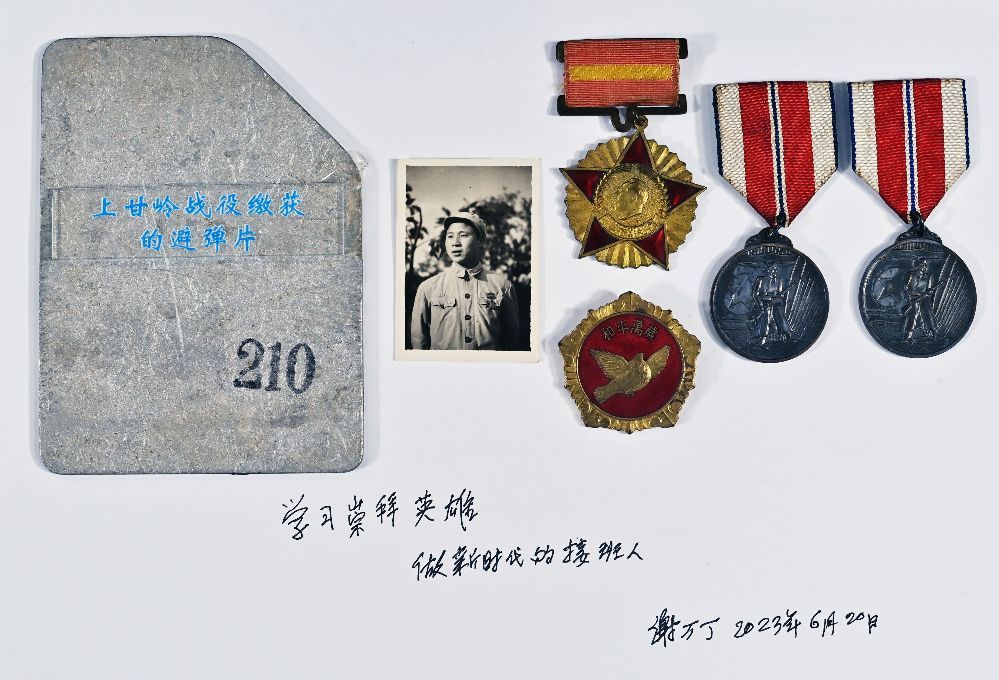 92岁,湖南郴州人,1951年10月入朝。中国人民志愿军15军45师134团3营7连文书,在战斗中背部受伤。后任45师前线指挥所组织干事,负责军情和保管烈士遗物工作。黄继光牺牲后的6张遗照就是由他妥善保管,并于2017年6月6日捐献给中国人民革命军事博物馆,弥补了黄继光烈士无照片传世的缺憾。谢万丁拿着志愿军缴获敌军防弹衣上的避弹片,他说,再强大的敌人都是纸老虎,在英勇的志愿军面前不堪一击。