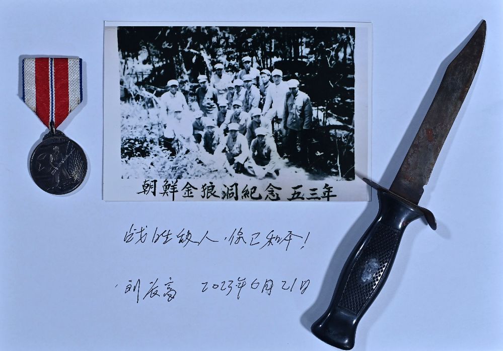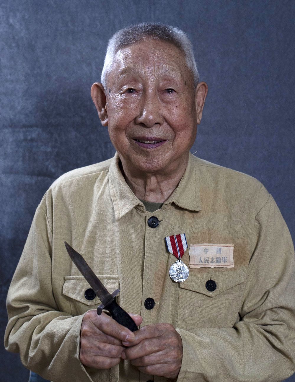 93岁,吉林柳河人,1952年入朝。中国人民志愿军44军132师396团1营机炮连指导员,为补充兵员,先后两次回国征兵入朝。荣立三等功。刘长富手上拿着的是志愿军缴获的美军匕首。