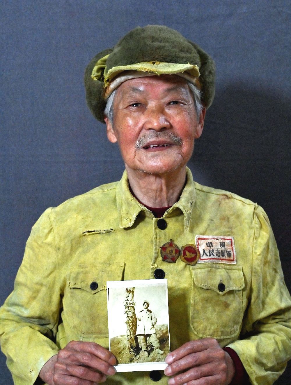 90岁,湖北武汉人,1951年1月入朝。中国人民志愿军16军47师146团3营文化教员。在反击仁川登陆战中构筑工事长达半年之久,后辗转到五圣山上甘岭高地阻击敌军多次进攻,荣立三等功。这张照片是他在上甘岭阵地上一棵被敌军燃烧弹烧焦的树干旁拍下的一张纪念照。