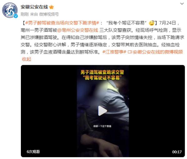 7月24日,亳州一男子酒驾被@亳州公安交警在线三大队交警查获。经现场呼气检测,显示其已涉嫌醉酒驾驶。在得知自己涉嫌醉驾后,该男子突然情绪失控,当场下跪请求交警。经交警耐心讲解,男子情绪逐渐稳定,交警带其前去医院抽血。经抽血检测,该男子血液酒精含量达到醉驾标准。