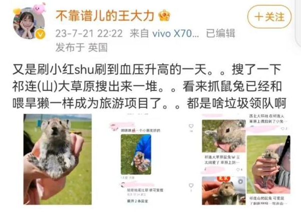 该博主说,搜了一下祁连(山)大草原,看到类似图片,“看来抓鼠兔已经和喂旱獭一样成为旅游项目了……”