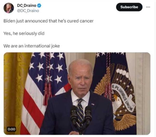 美国保守派人士罗根·奥汉德利称,“拜登刚刚宣布他治愈了癌症。是的,他真的做到了。我们是一个国际笑话。”↓