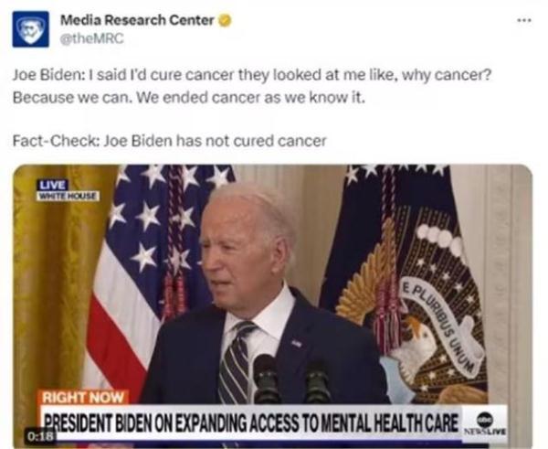 美国保守派机构媒体研究中心则进行了“事实核查”,“拜登:我说我会治愈癌症,他们看着我,好像在说,为什么是癌症?因为我们可以做到。我们已经终结了我们所知的癌症。事实核查:乔·拜登尚未治愈癌症。”↓
