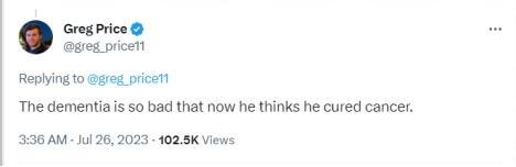 福克斯新闻网介绍,拜登言论很快引起批评者的注意,不少人开启吐槽模式。众议院保守团体“自由核心小组”成员格雷格·普莱斯评论称,“痴呆症太严重了,现在他认为自己治愈了癌症。”↓