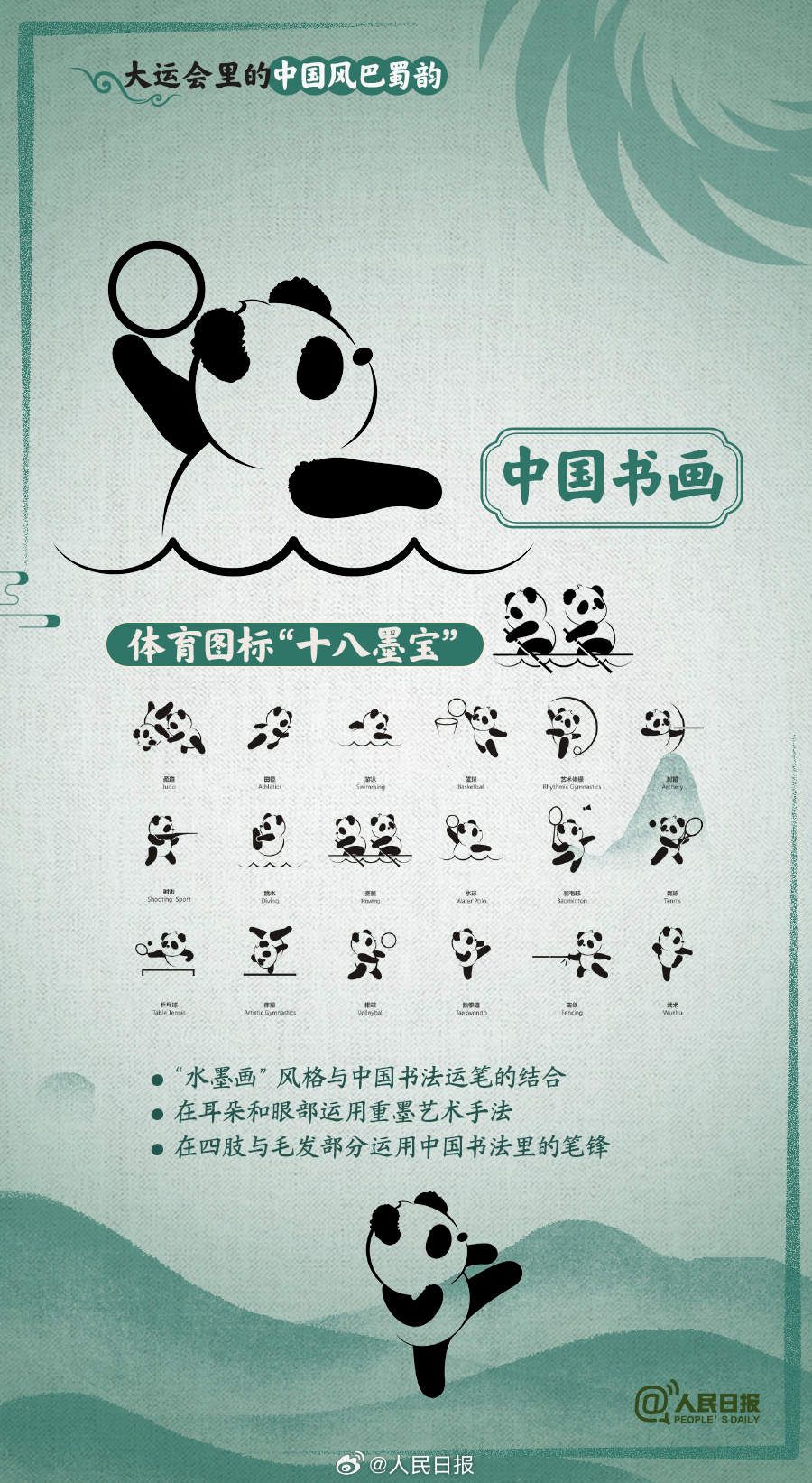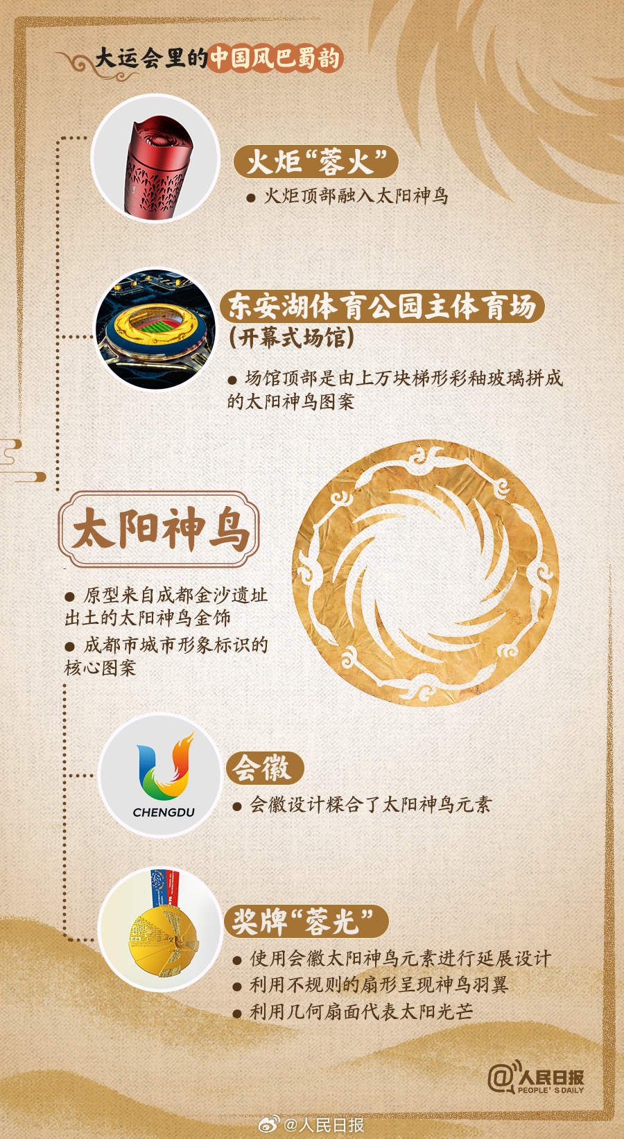 奖牌的太阳神鸟、会徽的传统色、绶带的芙蓉花、熊猫体育图标的中国书画…成都大运会里,处处可见“中国风”“巴蜀韵”↓↓大运会后天开幕,期待中国味儿满满的青春盛会!
