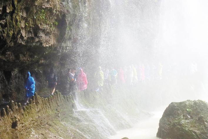 游客排队穿越三峡大瀑布。