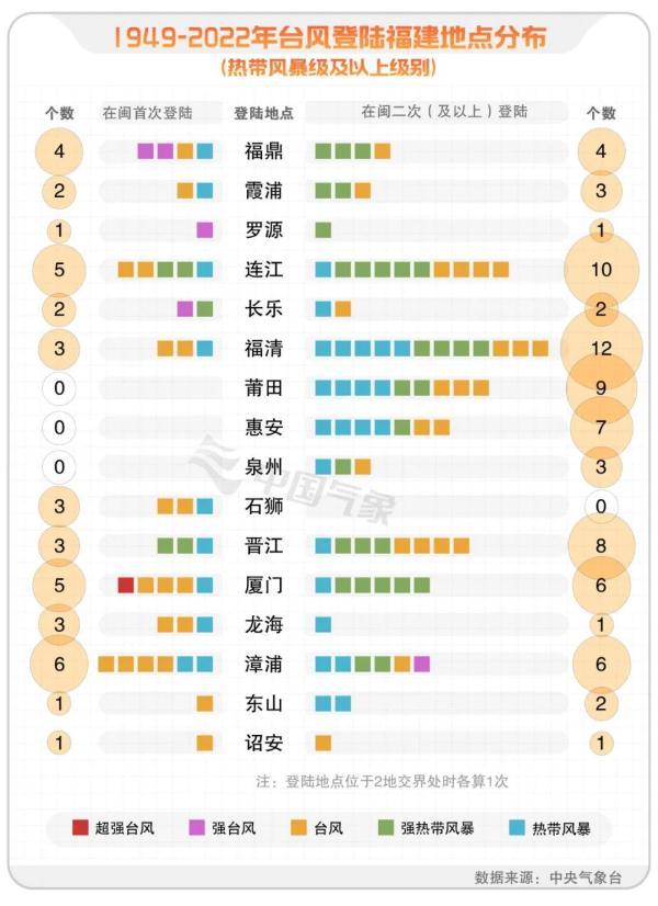 1949-2022年台风登陆福建地点分布(热带风暴级及以上级别) 数据来源:中央气象台