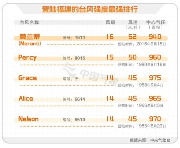 1949-2022年登陆福建的台风强度最强排行 数据来源:中央气象台