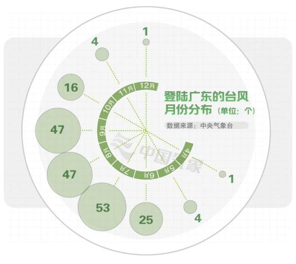 1949-2022年登陆广东的台风月份分布(单位:个) 数据来源:中央气象台