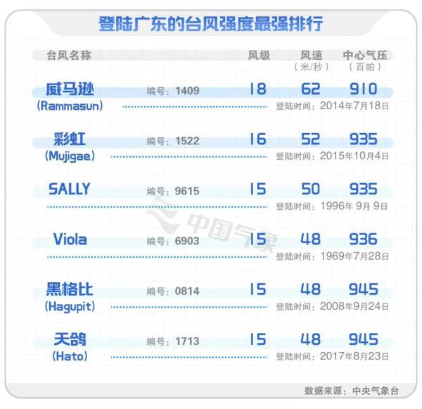 1949-2022年登陆广东的台风强度最强排行 数据来源:中央气象台