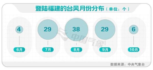 6月至10月都可能会有台风登陆福建,其中8月最多。根据中央气象台数据统计,1949至2022年,共有38个台风在8月登陆福建。从强度来看,登陆福建强度前4位的台风都是在9月来袭,其中就包括超强台风“莫兰蒂”。
