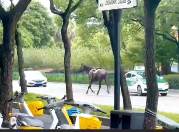 据他们描述,这匹马在前边跑,后边还有几名交警骑着电动摩托车、共享电单车紧追不舍。