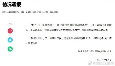 7月26日,张家界市永定区人民政府新闻办公室通报:有报道称“一男子在我市景区拍照时坠崖”,经公安部门查明核实,该消息不实,郑某系翻越安全护栏跳崖自杀身亡,排除刑事案件及其他因素。事件发生后,市、区高度重视,迅速开展调查和搜救工作,目前后续相关工作正在进行中。