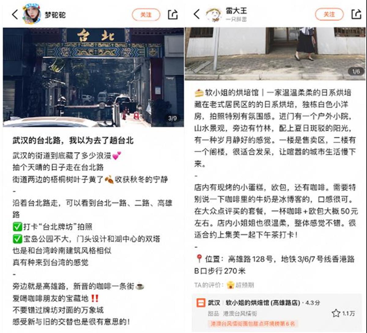 “这条路坐落长江之滨,全长约2500米,是大陆最早以台湾地名命名的道路之一。以台北路为主轴1平方公里范围内,台北一路、台北二路、高雄路、苗栗路、花莲社区、澎湖社区、宜兰社区、云林社区……在这些充满‘宝岛味’街道中,不管是骑单车,还是散步,都像是在台剧中。”大众点评上,博主李富沅在笔记中这样描述武汉台北路沿线。
