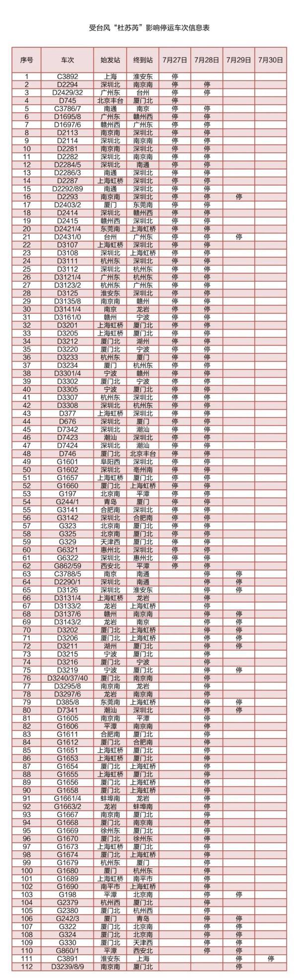 受台风“杜苏芮”影响,为确保铁路运输安全,7月27日起,长三角铁路部分列车停运(截至7月26日22时部分停运列车车次信息见附表)。