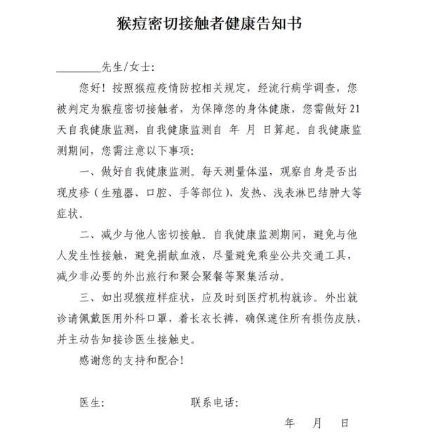 密切接触者自我健康监测期间可正常生活与工作,需避免与他人发生性接触等密切接触,避免捐献血液等;坚持每天做好体温测量和症状监测,出现猴痘样症状应及时就诊并主动报告可疑接触史。辖区疾控机构或基层医疗卫生机构应在密切接触者自我健康监测第7、14、21天上门或电话对其进行随访,提供咨询指导,发现异常情况及时进行处置。