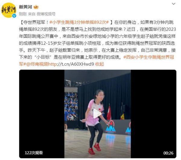 在你的身边,如果有3分钟内跳绳单摇892次的朋友,是不是想马上找到他或她学起来?近日,在美国举行的2023年国际跳绳公开赛中,来自西安市长安绿地城小学的六年级学生赵子鋡就凭借这样的成绩摘得12-15岁女子组单摇跳小项桂冠,成为首位获得跳绳世界冠军的陕西选手。昨天下午,赵子鋡载誉归来,她表示,在大赛上稳定发挥,自己非常满意,接下来的“小目标”是在明年亚锦赛上取得更好的成绩。