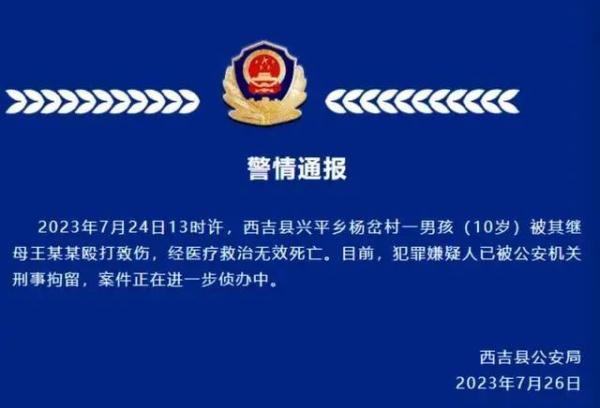 2023年7月24日13时许,西吉县兴平乡杨岔村一男孩(10岁)被其继母王某某殴打致伤,经医疗救治无效死亡。目前,犯罪嫌疑人已被公安机关刑事拘留,案件正在进一步侦办中。
