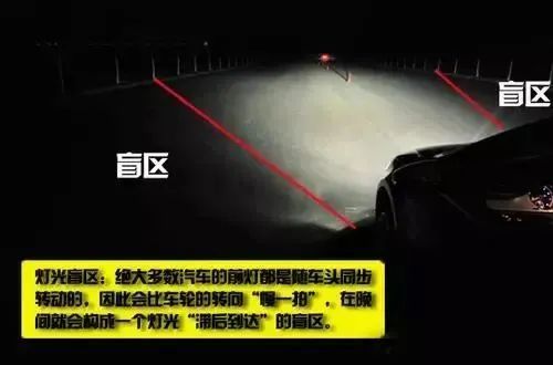 ⑧灯光盲区:汽车前灯都是随车头同步转动的,会比车轮的转向“慢一拍”,就会构成一个灯光“滞后到达”的盲区。如果车速过快,当灯光照射到的时候车就可能撞到路边的物体或行人了,在连续弯道的地带,这种危险更大。