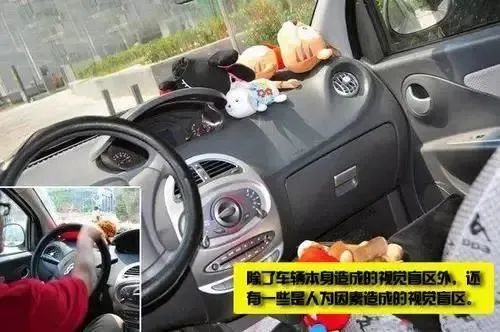 ⑤ 人为盲区:主要是挡风玻璃上贴颜色较深的贴膜,或在挡风玻璃上悬挂毛绒玩具、后挡风玻璃下放置物品等。