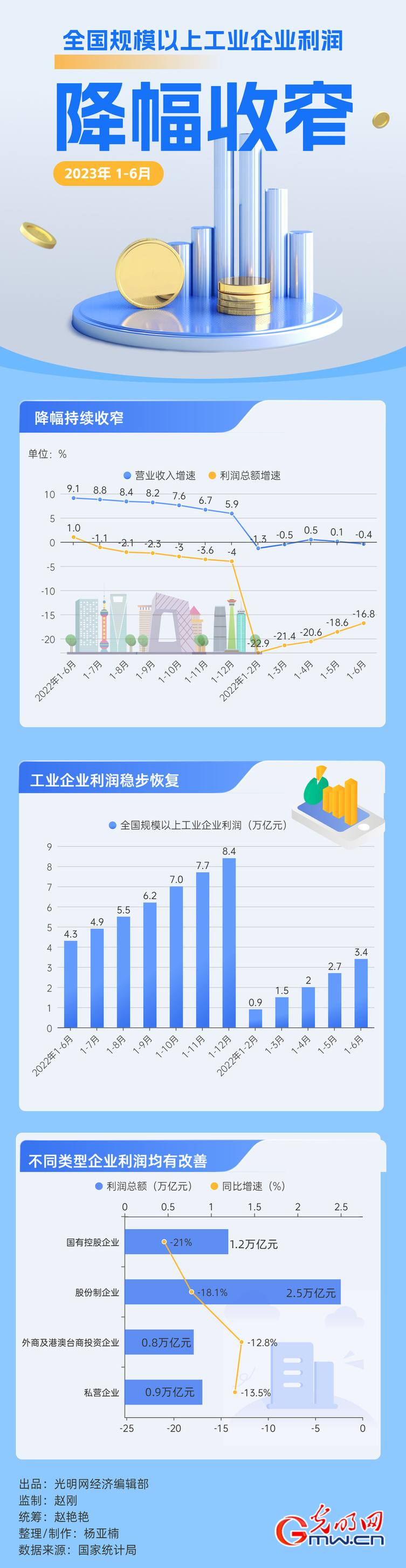 光明网讯(记者 杨亚楠)7月27日,国家统计局公布上半年工业企业利润数据。数据显示,1—6月份,全国规模以上工业企业实现利润总额33884.6亿元,同比下降16.8%,降幅比1—5月份收窄2.0个百分点。国家统计局工业司统计师孙晓表示,今年以来,随着推动经济持续回升向好各项政策措施落地显效,工业生产稳步恢复,企业盈利逐月改善。