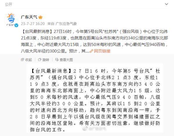 据@广东天气,27日16时,今年第5号台风”杜苏芮”(强台风级)中心位于北纬21点3度,东经119点3度,也就是在距离汕头市东南方向约340公里的南海东北部海面上,中心附近最大风力15级,达到50米每秒的风速,中心最低气压940百帕,八级大风半径约300公里。预计,其将以15到20公里的时速向西北方向移动,趋向粤东到闽南沿海一带,于28日早晨到上午以强台风级在闽离交界到福建晋江之间的沿海地区登陆。